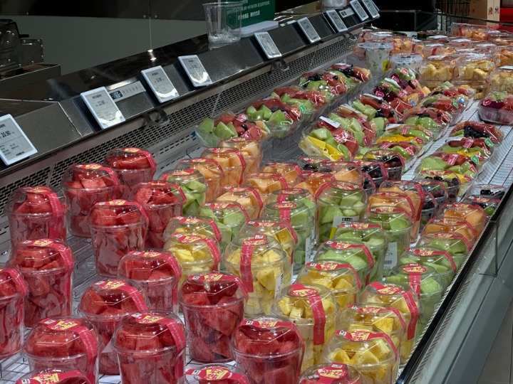 记者在水果区遇到果蔬运营负责人陈学海时,他正和同事研究椰子的大小。品上生活销售的椰子,顶部有一个可以按压的塑料开口器,“为了方便按压,正式营业后,工作人员将椰子外壳砍得更薄,但又有顾客疑惑,相同的价格下,椰子似乎变小了?”店员们比划着商量,将椰子砍到什么程度更为合适。