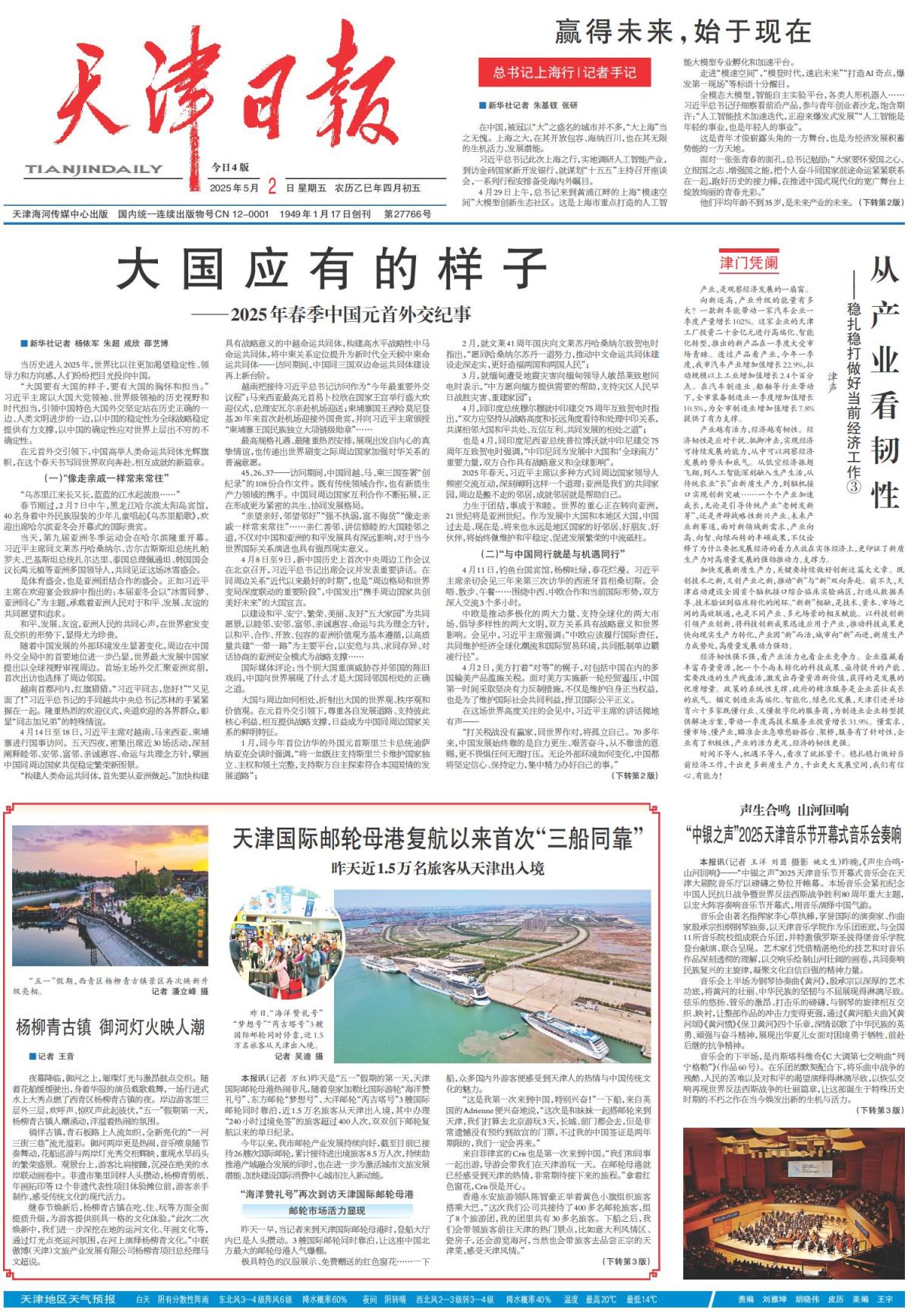 昨天是“五一”假期的第一天,天津国际邮轮母港热闹非凡,随着皇家加勒比国际游轮“海洋赞礼号”、东方邮轮“梦想号”、大洋邮轮“芮吉塔号”3艘国际邮轮同时靠泊,近1.5万名旅客从天津出入境,其中办理“240小时过境免签”的旅客超过400人次,双双创下邮轮复航以来的单日纪录。详情>>