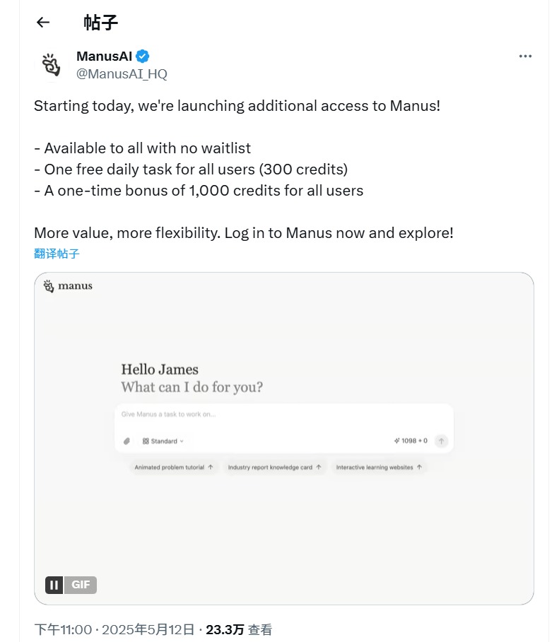 5月12日星火配资,曾因注册码被爆炒至10万元、长期处于“一码难求”状态的AI智能体平台Manus,宣布面向全球用户开放注册。Manus在公告中表示,Manus向所有人开放,无需等待名单;所有用户每天可免费执行一项任务(300积分),所有用户一次性获得1000积分奖励。