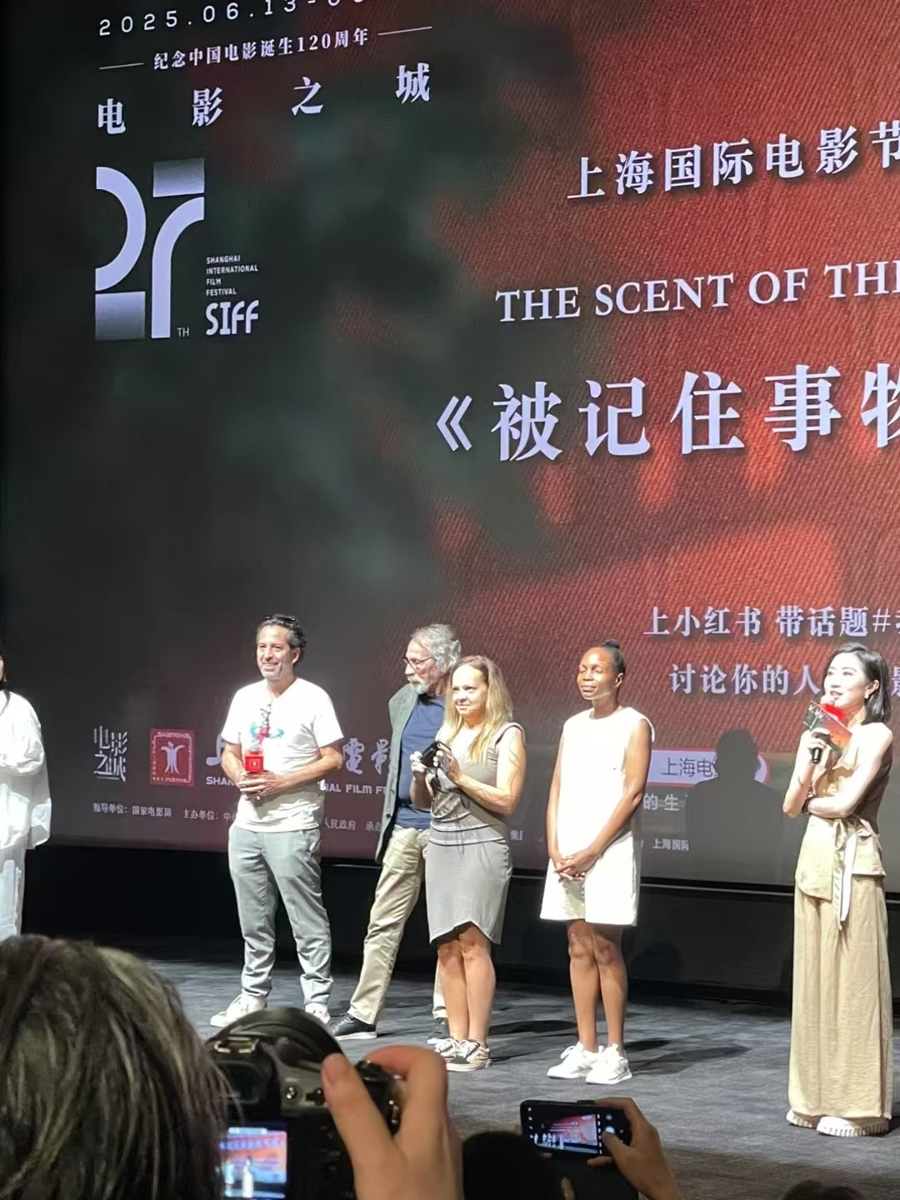 这一天的美好远还没有结束。“散场后,我平复心情,溜达下楼,‘转角遇到爱’,又看到《被记住事物的气味》的导演了。”虽然从大学时候就每年守着上影节抢票、看片,虽然五六年来都是金爵奖主竞赛单元的忠实追随者,但陆懿回忆说,“我真的是鼓足了勇气才冲上去跟导演打招呼的,因为我特别想告诉他,我太喜欢他的电影了,‘哭得我的妆都花了’。结果,导演超级温柔地笑着说,‘You look beautiful even with your makeup off.(你即使妆花了,也很漂亮)’谁懂啊,被导演夸了!妆花了也值了!火速‘集邮’,合影留念!”