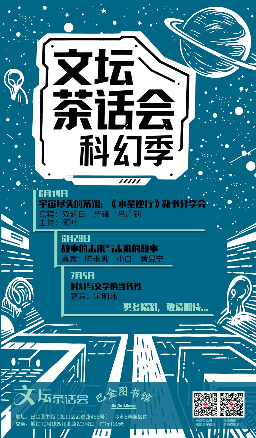 巴金图书馆“文坛茶话会”系列讲座品牌,以《文坛茶话图》为渊源,助力经典作家作品的新时代解读传承,也紧密关注当下文学文化发展热点,邀请作家学人共话当代文学发展的新可能。“科幻文学是否已成为文学正典?”“AI写作对文学写作产生了怎样的影响?”……韦尔斯利学院东亚系讲席教授兼系主任、学者宋明炜,科幻陈楸帆,华语科幻星云奖最佳短小说得主双翅目,作家陈茜,现象级幻想小说集《宛转环》作者慕明,与复旦大学中国语言文学系教授严锋,复旦大学外国语言文学学院讲师、中国科幻研究中心“起航学者”吕广钊,作家小白,上海译文出版社副总编辑黄昱宁等将陆续做客巴金图书馆分享讨论。